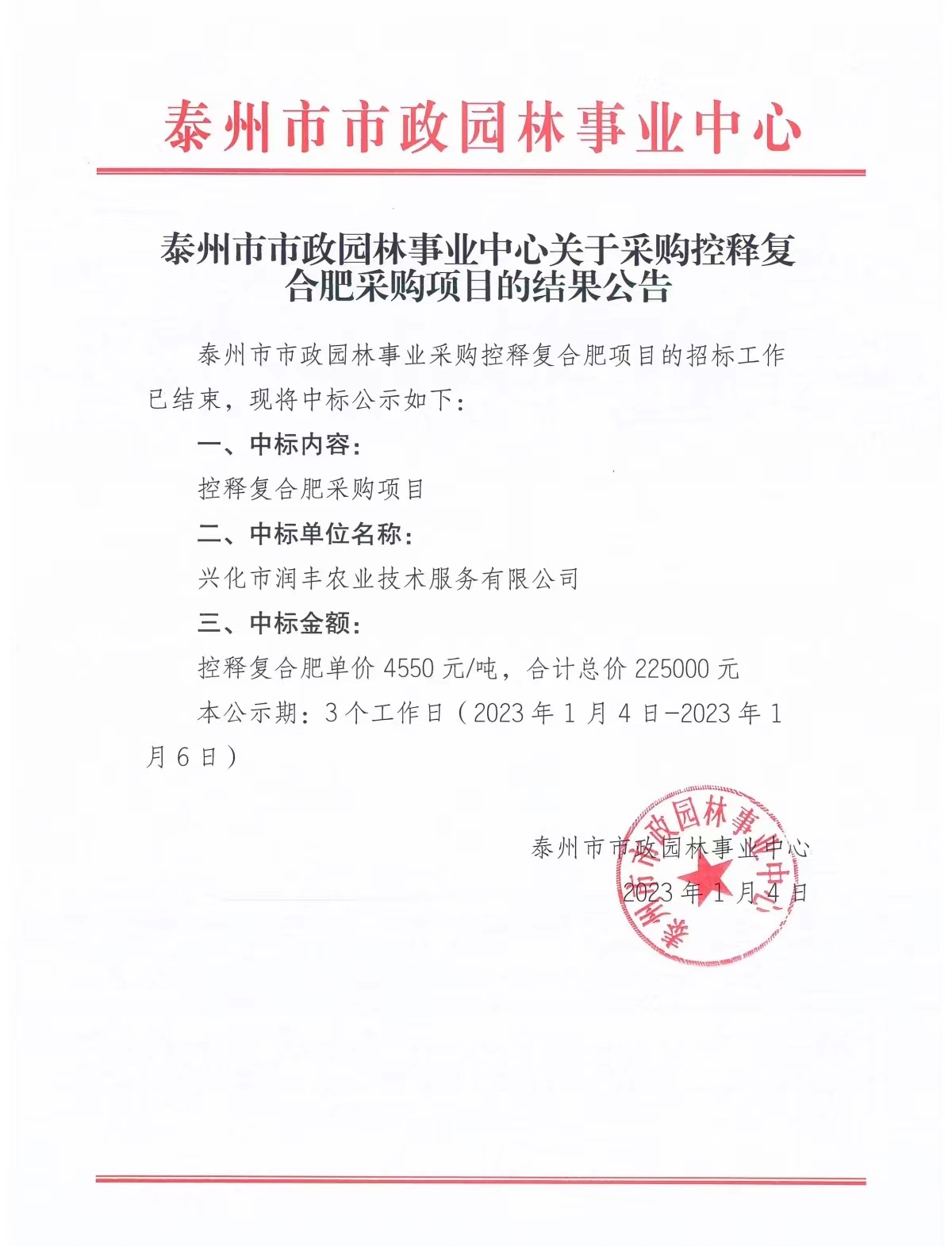 泰州市市政园林事业中心关于采购控释复合肥采购项目的结果公告