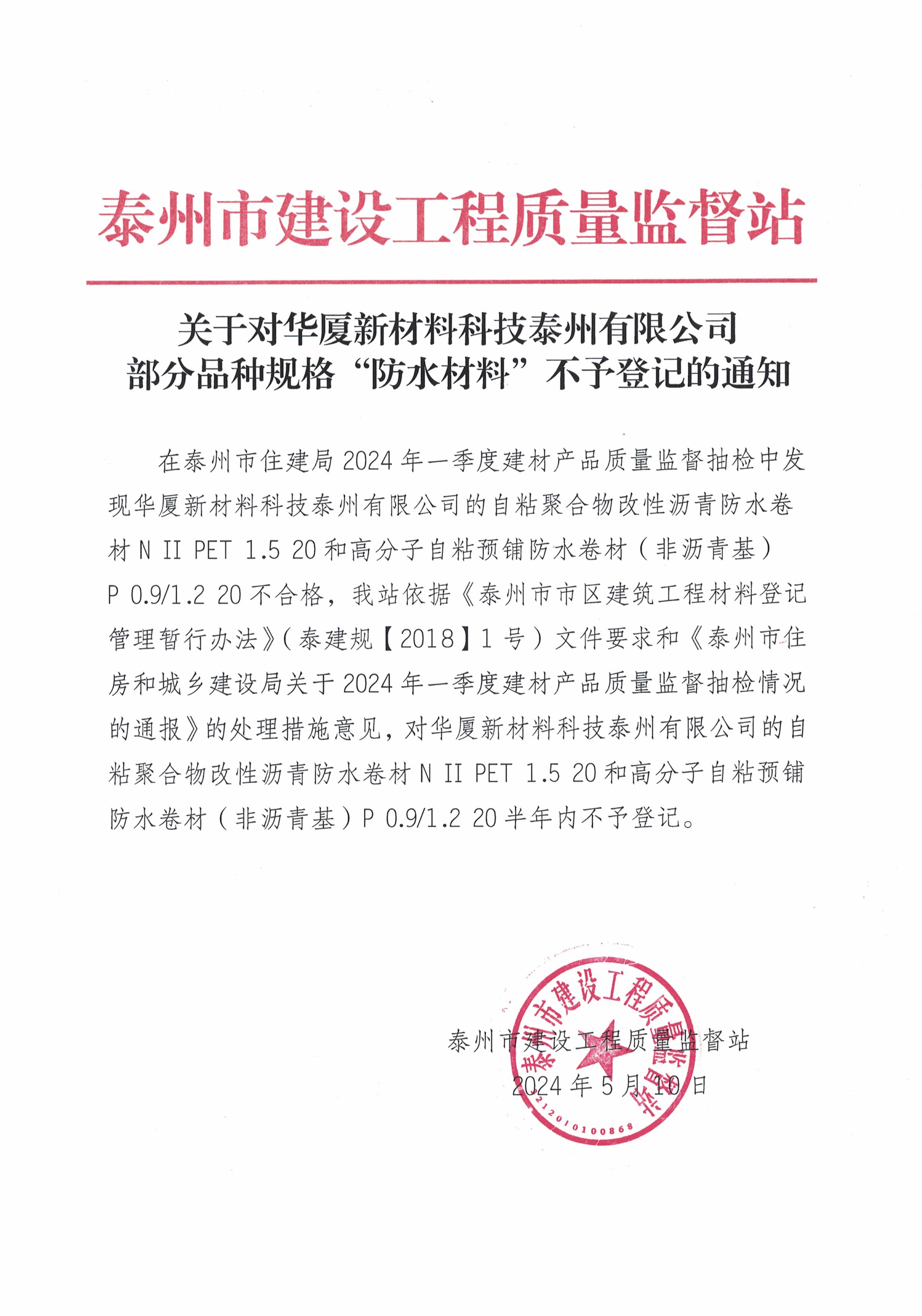 202306004 | 华厦新材料科技泰州有限公司 | 防水材料 | 华厦新材料科技泰州有限公司 | 王东鸣/18852668908 | 2023.4.21 2025.6.19 | 2024.4.20 2026.6.18 |